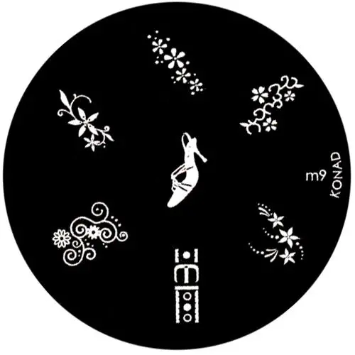 Körömnyomdás lemez, mely minden díszítést színesebbé tesz. A fém sablon 7 különféle mintát tartalmaz: különféle virágok, ornamentumok és cipő. Használata csak a fedő fólia eltávolítása után lehetséges.