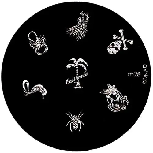 Minták: egyszarvú, pók, kígyó - kobra, skorpió, sas, halálfej és pálmafa ,,California" felirattal.