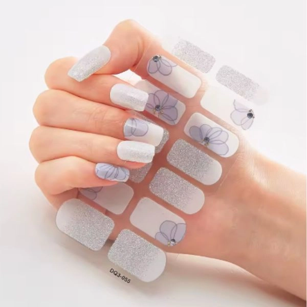 Teljesen fedő körömmatricák, ezüst virágokkal és világoszöld.
